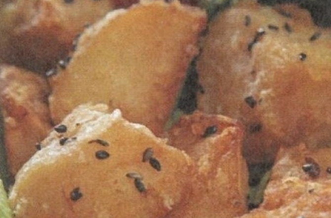 肉じゃがの残ったじゃがいもの汁気を切って、小麦粉をまぶして揚げるだけ。アクセントに黒ごまを振ってもおいしいです。