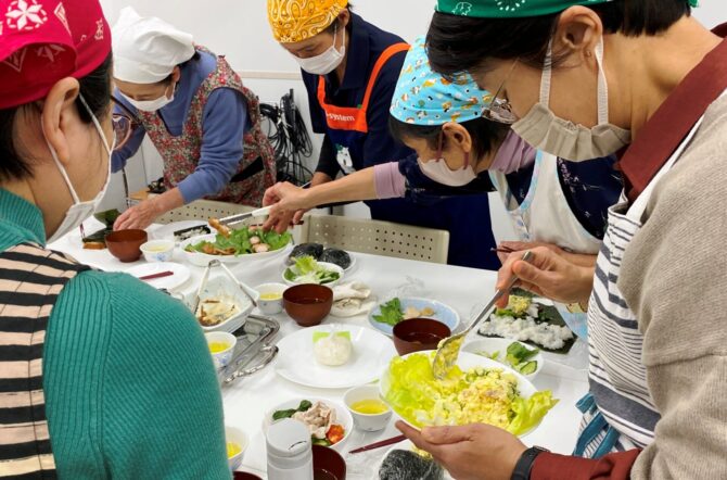 ちば緑耕舎のこしひかりに、千葉のこめ豚のしゃぶしゃぶ、米沢郷鶏もも肉の照り焼き、野付のほたて、大隅産うなぎ、すすき牧場牛と佐原農産物供給センターのごぼうでしぐれ煮、サンドファーム旭のサラダ、他にも産直具材をたくさん並べて、何を具に入れるかみんな笑顔で悩んでいました。デザートには長有研のみかん、佐原農産物供給センターのさつまいもの甘露煮も!お腹いっぱい満足なランチになりました。