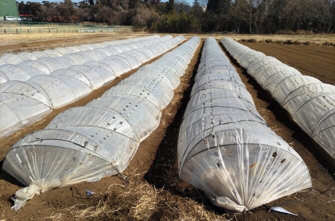 冬場の露地栽培を支えているのは、畝(うね)に半円状の支柱を立てて、その上に防寒用のフィルムを被せる「トンネル栽培」です。2月の雪の日には苗をしっかり守ってくれていました。