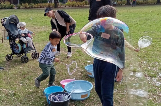 遊びの内容は、ロープワーク、シャボン玉、たき火などさまざまです。小さい子たちは家では作れない大きなシャボン玉作りに興じ、小学生は近所のお店で段ボールをもらってきて自分たちで考えて遊んでいます。自治会が水道を自由に使わせてくれる公園もあり、水遊びや泥んこ遊びも体験できます。