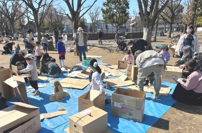 東海面公園(南行徳4丁目)、行徳南部公園(幸2丁目)、行徳駅前公園(湊新田2丁目)の3カ所の公園で年4回プレーパークを開催しています。天候にもよりますが、ふだんは2,3百人の参加者があり、多いときは500人も集まり好評です。とくに小さいお子さんのいるご家庭で楽しみにしているという声が多いです。