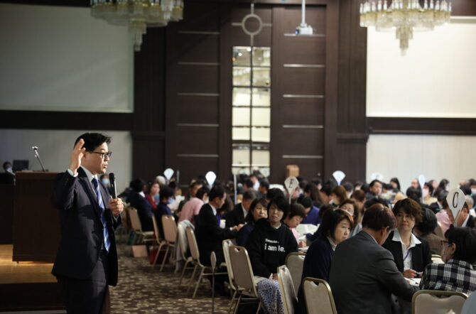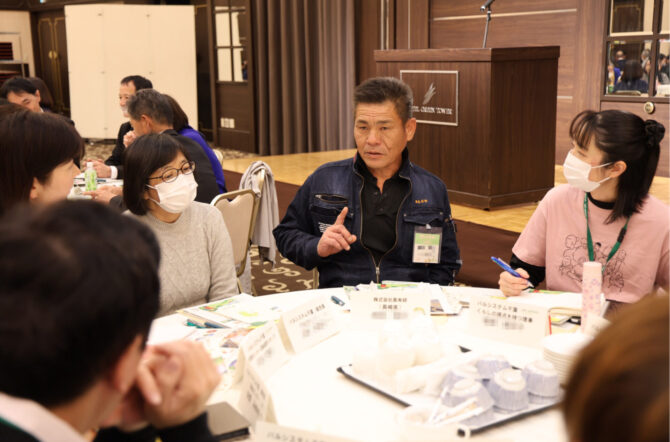 講座の後は同テーブルでのトークタイムです。各テーブルには生産者・組合員・職員が着席しており、質問や意見交換の時間です。組合員が農産物を育成するための各産地の努力や苦労を聞くのはもちろん、組合員からの要望や応援メッセージを生産者が直接聞くことができる貴重な時間です。多くのテーブルで話題になったのは近年の温暖化、肥料・飼料高騰による苦労や対策についてでした。