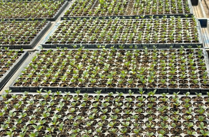 育苗棟で種から育成している「モロヘイヤ」の苗