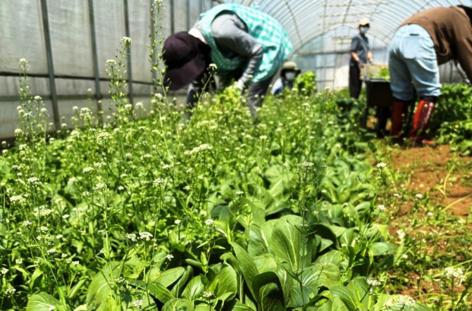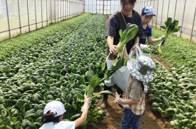 ハウスでは元気に育った小松菜・チンゲン菜・水菜・ルッコラ・べか菜の収穫体験!野菜を引き抜くと根っこに土が付いてくるため、サラサラした土をはたいてから袋に入れていきます。根っこ付き野菜に触れるのも貴重な体験になります。