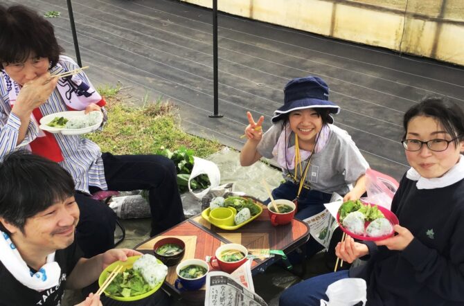 エコ・チャレンジ以上の栽培基準で野菜を栽培しているパルグリーンファームでは「草とり」が必須です。人気の「とれたて便」の出荷作業に加え、畑の整備も行っています。除草剤を使用しない畑で元気に(!?)育つ雑草に負けじと、時には産直サポーターの手も借りて除草作業に励みます。
