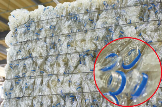 圧縮されたかたまりは「ベール」といいます。1日70本ほど製造しているそう。品目別にそれぞれの工場へ運び、再生・再利用されます。