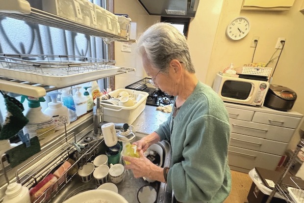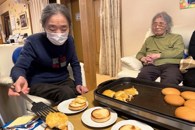 その日はハンバーガーのバンズを安く仕入れられたので、おやつにハンバーガーを作りました。リビングのテーブルにホットプレートを出して、具材を焼いたり、バンズを温めてはさんだり…。中にはハンバーガーを初めて食べたという方もいて、自分たちで作ったハンバーガーを頬張りながら、和やかなひとときとなりました。