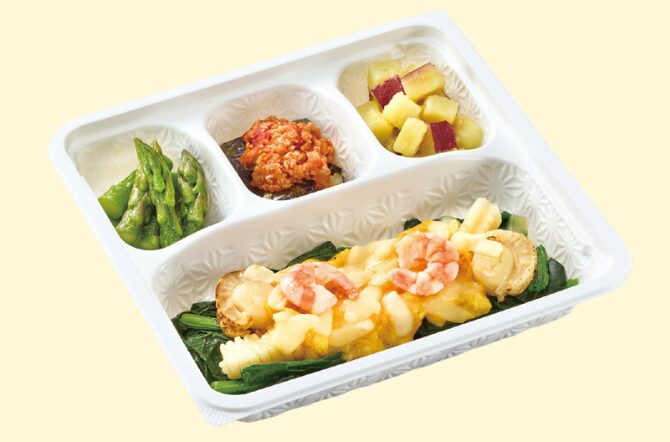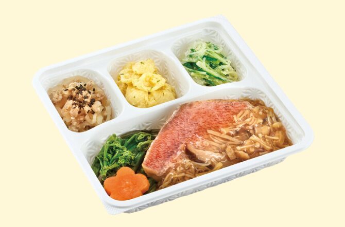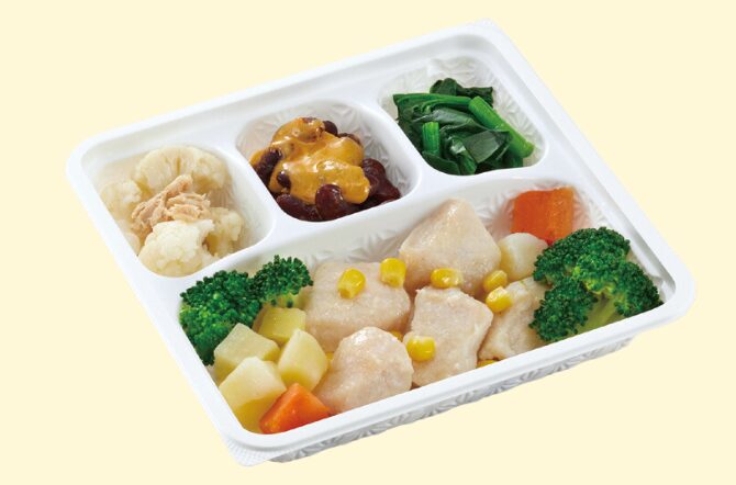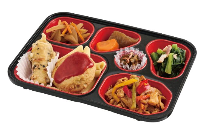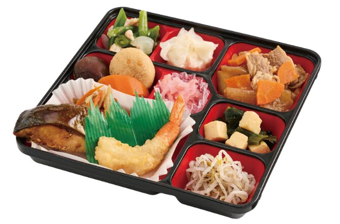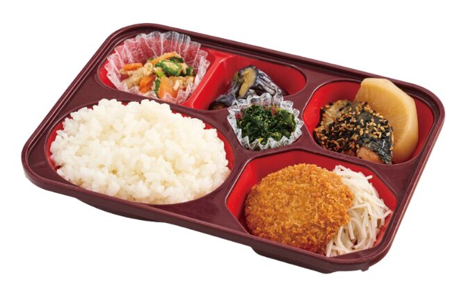 一番人気の「おかずタイプ」は、6種類のおかずが彩りよく盛りつけられ、栄養バランスのとれた食事になっています。だしのうまみで塩分を抑えつつ、うまみを引き出しました。