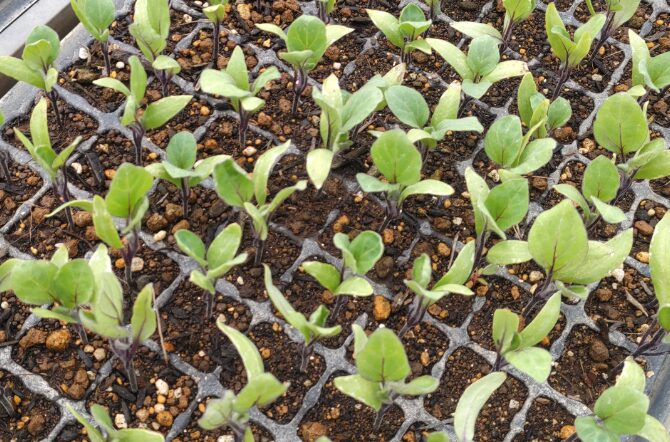 「小松菜(緑)、チンゲン菜(赤)、べか菜(白)、みず菜(黄)、ルッコラ(黒)、サニーレタス」をお届けいたします。