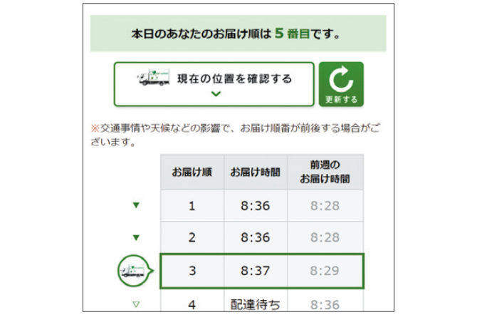 配達日には、「お届け>配達状況」から、配達がどこまで進んでいるのかを確認できます。当日の予定を立てやすいと好評です。 -