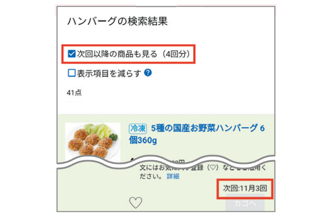 右上の虫眼鏡マークから商品の検索ができます。原材料や栄養成分も確認できます。今回取り扱いがない商品も、次回以降4回分までの予定がわかります。