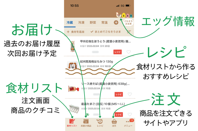 「お届け商品」から、過去に届いた食材や今週届く食材を確認できます。各商品名をタップすると、商品情報やクチコミを見られるようになっています。注文サイトやアプリと連携