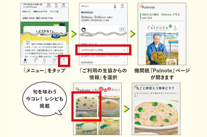 機関紙『Palnoteプラス』のバックナンバーはパルシステム千葉のホームページからご覧いただけます。そのまま画像で見られるPDF版のほか、Web用に見やすくまとまった特集ページWeb版『Palnote』もおすすめです。そのほか、これまで『Palnote』“旬を味わう今コレ!”コーナーでご紹介したレシピも掲載しています。 -