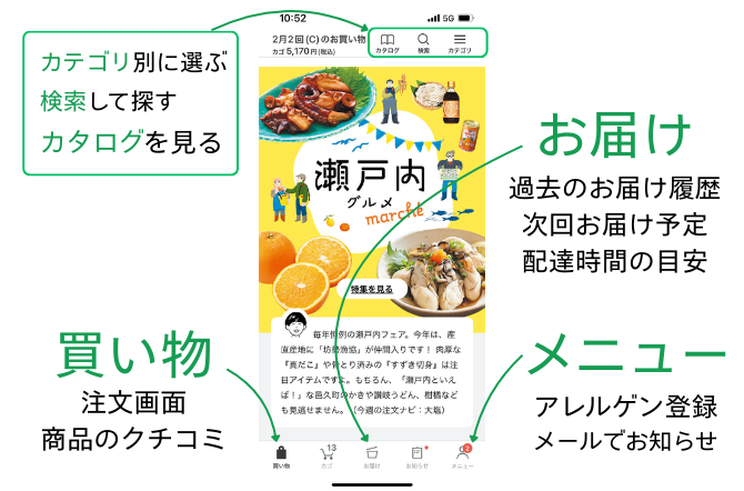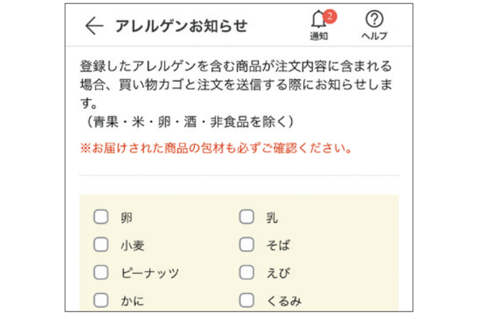 「メニュー>設定>アレルゲンお知らせ」からアレルゲンを登録しておくと、買い物カゴに該当商品が入ったときにアラート(お知らせ)が出ます。 -
