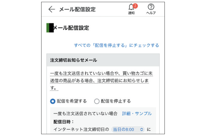 買い物カゴに未送信の商品が残っていたり、欠品などが生じたりすると、お知らせメールが届きます。「メニュー>設定>メール配信設定」から必要に応じて設定できます。