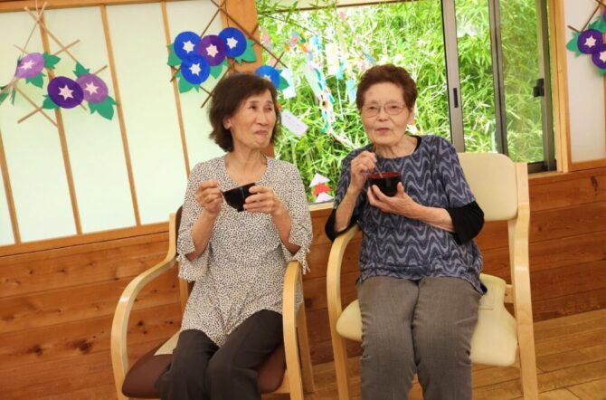 笹飾りの前で白玉ぜんざいを食べて涼んでいるのは、今月誕生日を迎えた利用者の方たちです。まるで織り姫さまみたいでした。