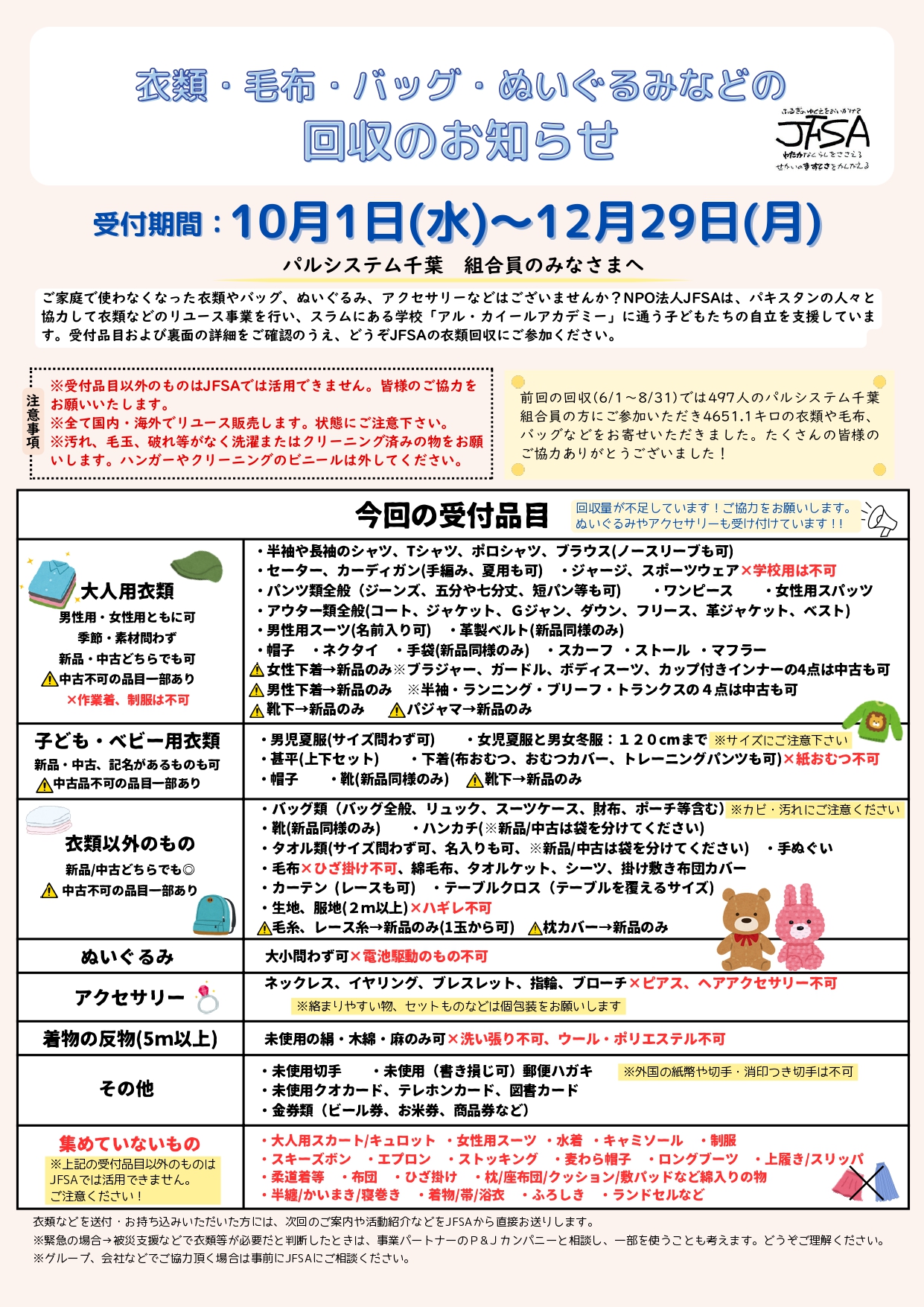 NPO法人JFSA(日本ファイバーリサイクル連帯協議会)は、衣類等をリユースしてパキスタンの子どもたちの教育を支援し、平和な社会環境をつくることをめざしています。パルシステム千葉はJFSAと連携して平和国際交流を行うために、衣類リユース回収の支援と協力を呼びかけています。