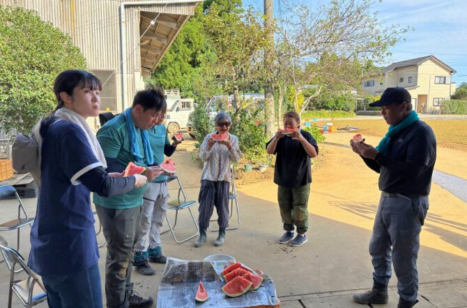 休憩には嶋田さんが育てたスイカをごちそうになり、一生懸命汗をかいた体にしみわたりました。