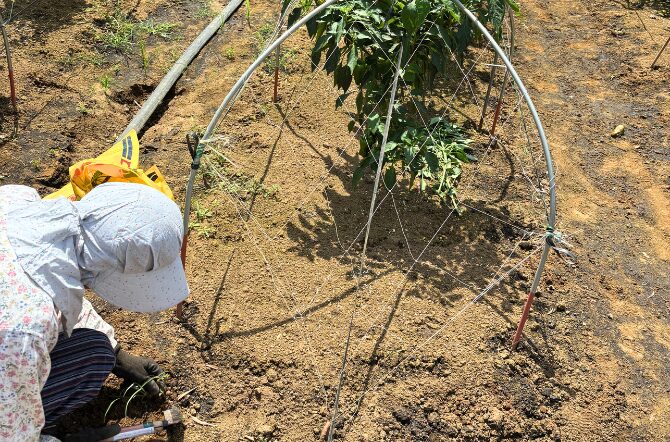 ピーマン畑へ移動して畝間の草とりをしました。ピーマンの苗は支柱と網で支えられ、整然と並んでいます。
