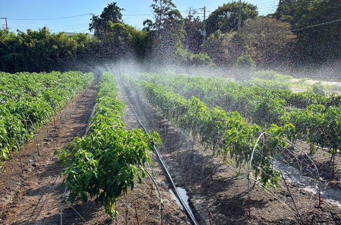 おいしそうなピーマンがたくさん成っています。畝間に生えた雑草もきれいに刈りとり、スプリンクラーで水をまきました。