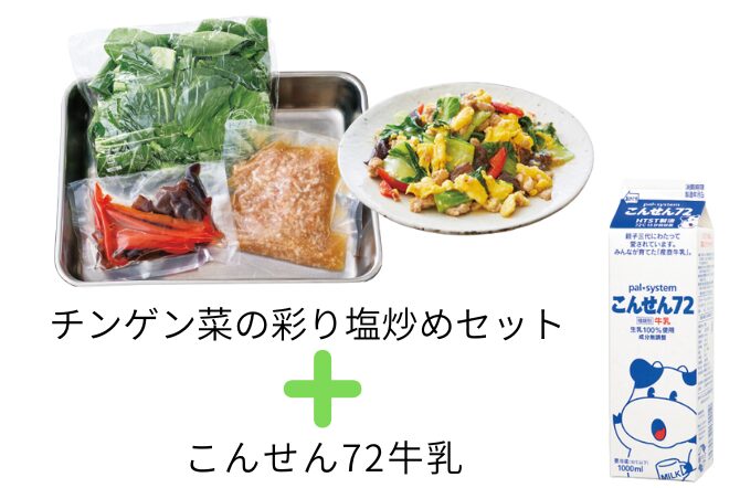 チンゲン菜の彩り塩炒めセットと牛乳で
