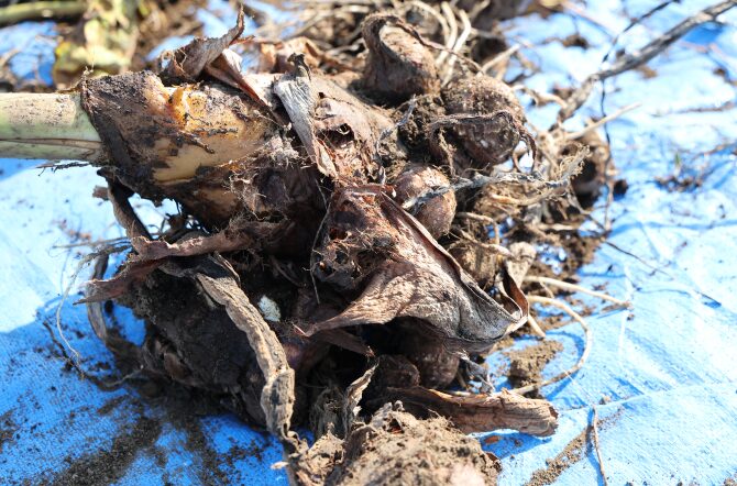10時に集合して、まずは里芋の出荷作業。大きな塊のような親芋から、子芋・孫芋を一つひとつ取り外していきます。さらに、取り外した里芋はていねいに土やヒゲを取っていきます。曇り空の肌寒い中でのスタートとなりましたが、時折り日差しが射すと気温も上がり、子どもたちは汗をかきながらも集中して黙々と作業を進めてくれました。
