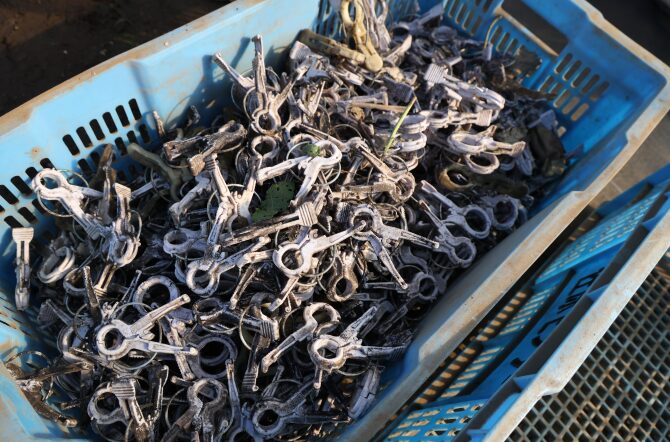 夏が終わり、ナスの収穫後のビニールハウスの片づけを行います。ナスを吊るしているヒモと誘引ばさみを1つ1つ外していきます。