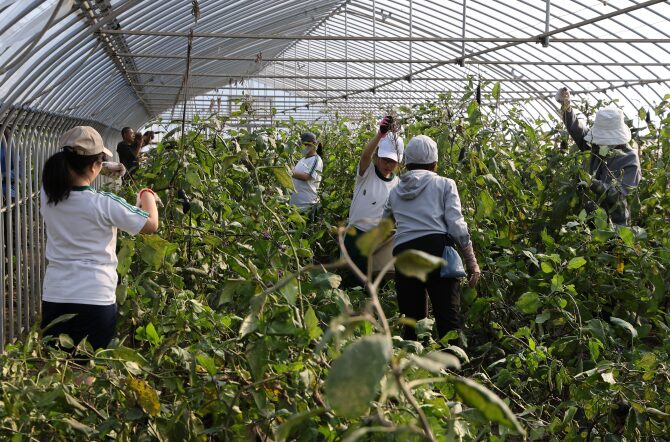 午後、気温も上がってきた中でハウス2棟分の作業はなかなか大変でしたが、生徒たちは誘引ばさみの取り残しがないか細かくチェックしながら作業してくれました。