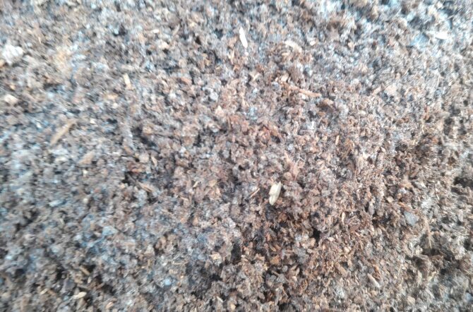 最初に増える糸状菌(カビの仲間) が優位な段階では、堆肥は粉を吹いたように白っぽく見えます。このあと病原菌が嫌う酵素を出す放線菌が増えていきます。