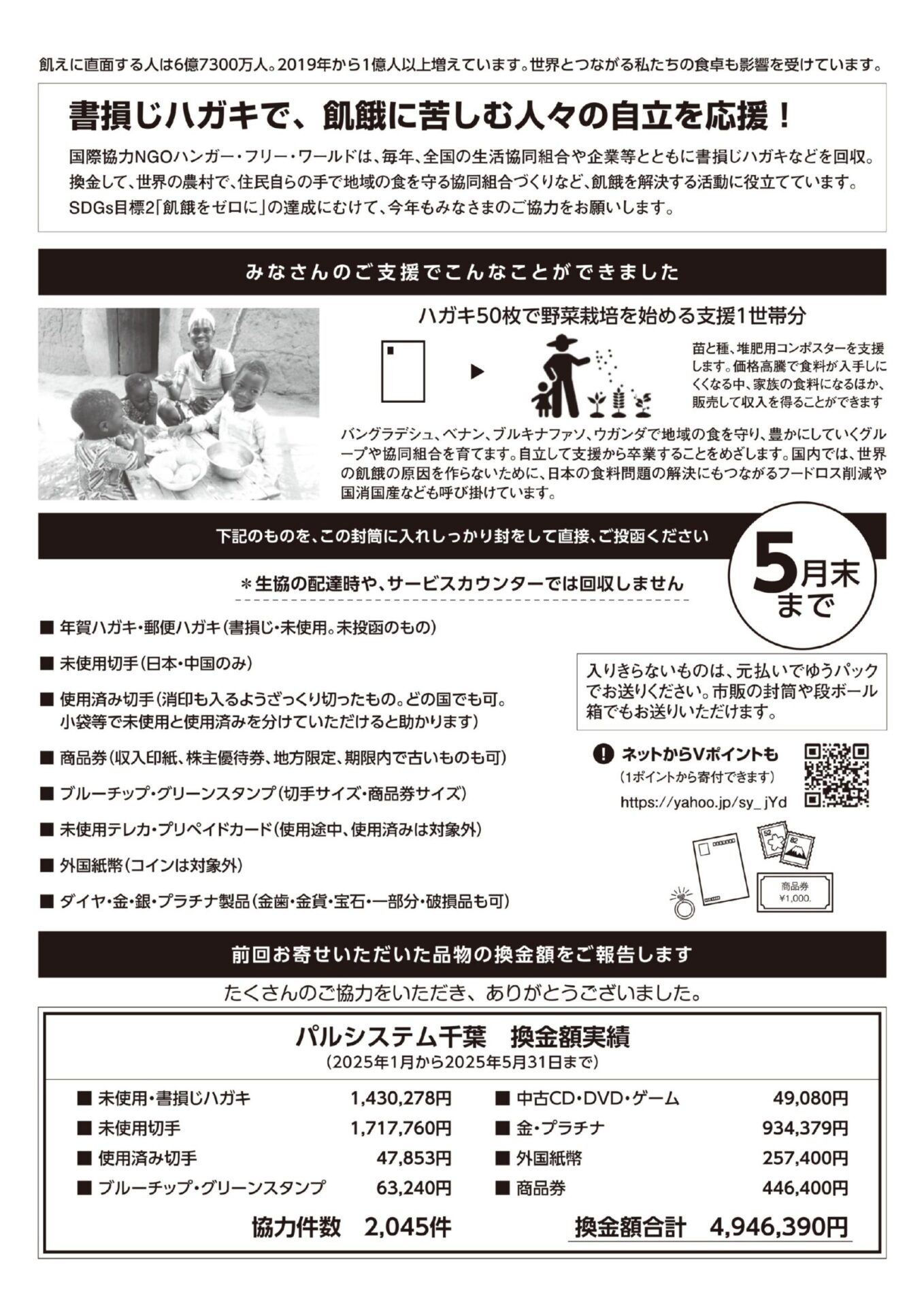 民間国際協力団体「認定NPO法人ハンガー・フリー・ワールド」では、書損じハガキや未使用切手などを集めて換金し、発展途上国の貧しい人々の自立支援に充てています。前回は組合員の皆さまから2,045件のご協力があり、4,946,440円相当の支援になりました。たくさんのご協力ありがとうございました。現在、第25回となる回収キャンペーンを実施中です。ハガキ等を郵送する専用封筒を、1/19(月)~23(金)に配付している2月1回カタログといっしょにお届けしています。皆さまのご協力をお願いします。
