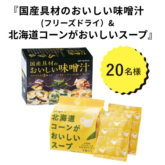 『国産具材のおいしい味噌汁(フリーズドライ)&海道コーンがおいしいスープ』を抽選で20名の方にプレゼント♪
