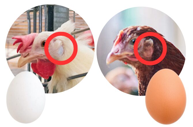 白玉と赤玉は親鶏の種類で変わり、実は耳たぶの色で決まるのだそう。耳たぶが白い鶏からは白い卵が、赤色の鶏からは茶色(赤色)の卵が産まれ、エサや環境で変わることはありません。一般的に赤玉を産む品種の方が体が大きい傾向があり、産む卵も若干大きめなことが多いですが、栄養価などに違いはありません。