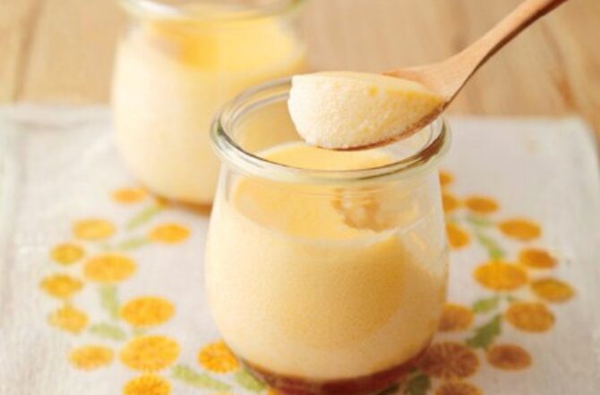 - 小鍋に砂糖(カラメル用)と水(大さじ2)を入れて火にかける。カラメル色になったら火を止めて、水(大さじ1)を加えて耐熱カップに注ぎ、カラメルの上に2を静かに注ぐ。