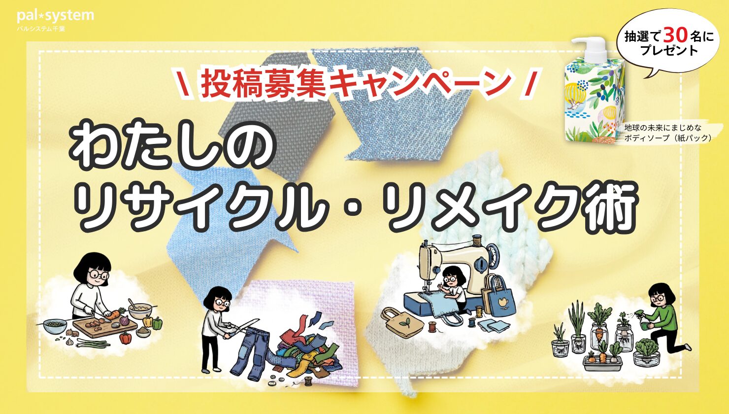 パルシステムは、「配達」と「回収」という生協ならではの仕組みを生かし、長年3R(リデュース・リユース・リサイクル)に取り組んでいます。“わたしのリサイクル・リメイク術”をテーマに、写真やエピソードを募集します!抽選で30名へ『地球の未来にまじめなボディソープ(紙パック)500ml』をプレゼント。集まったエピソードの一部は、本キャンペーンページにて紹介させていただきます。ぜひご参加ください。