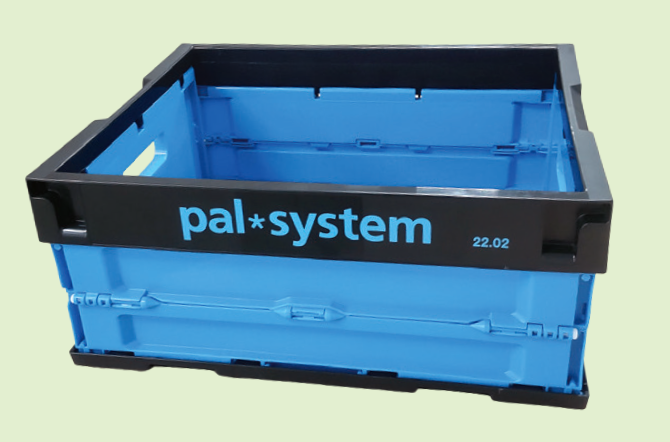 折りたたみコンテナは、底と上部の枠部分に再生プラスチックを使用したものが導入されています。上下の黒い枠部分が再生プラスチックでできています。