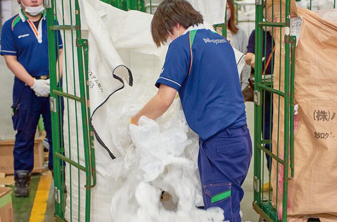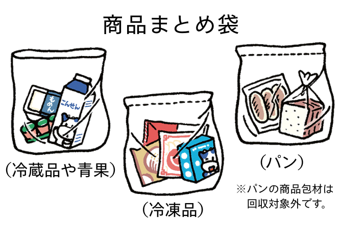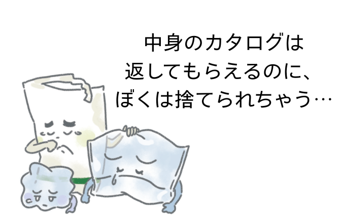せっかく返却していただいた資材に“異物”が混ざると、資源としてリサイクルできずにごみとなってしまうことがあります。個々の商品の包材は、材質の違いなどもあり現状ではリサイクルすることはできません。まとめ袋に商品包材やビニール袋などが混ざっていた場合、異物混入とならないよう、配送センターやリサイクルセンターで手作業で除去しています。カタログやまとめ袋を輪ゴム等でまとめるのも異物混入につながりやすいため、そのまま出してください。