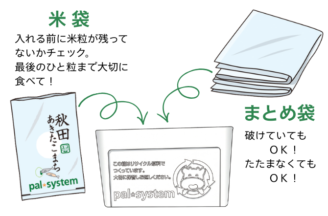 米袋・まとめ袋の出し方は、配達担当に直接手渡しいただくか、ご不在にされる場合は通い箱に入れるだけでOKです。
