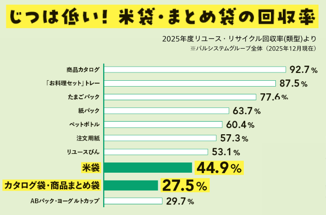 その一方で回収率が低いのは、米袋とカタログ・商品まとめ袋…。捨てればごみでも、返却すれば資源に!役目を終えた袋たちに、再び活躍してもらいませんか?