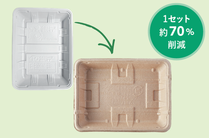 白いプラスチックトレーを紙製に変更。素材 を入れる袋はプラスチックのままでも、1セット 当たり25gから7gへ約70%削減しました。