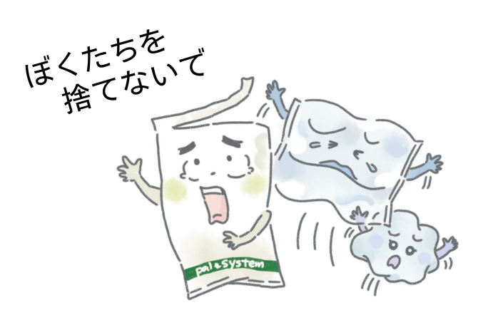 商品まとめ袋を作る際、どうしても余ってしまう端の部分を原料として再利用。再生プラスチックとして商品まとめ袋に10%配合しています。