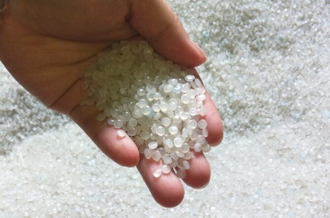 ④ベールを破砕、熱で溶かして米粒状のペレットに再形成