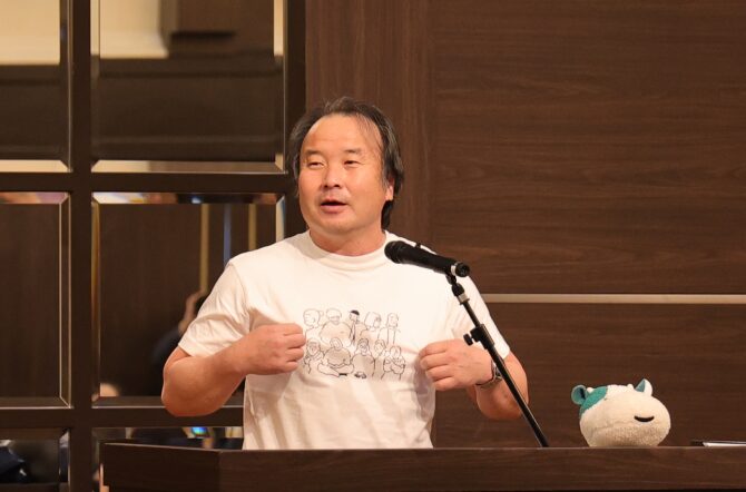 冒頭、県内産地のサンドファーム旭代表取締役の金谷雅幸さんが「私たちがパルを選ぶ理由」と題して自身のパルシステムとのつながりのエピソードを紹介しました。金谷さんはパルシステム東京の前身生協で配達担当として働いていた経験があり、利用者、生産者、役職員それぞれの視点でパルシステムを捉えています。