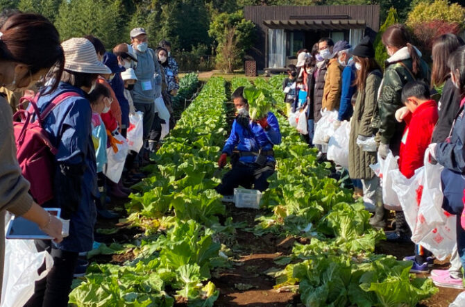 ミニ白菜の収穫体験。他にもチンゲン菜、長ねぎを収穫。