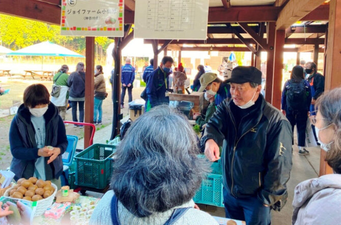 《ジョイファーム小田原》ではキウイの試食・販売。参加者と話しが弾む代表の鳥居さん。