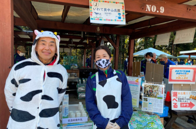 《奥中山高原農協乳業》では素敵なコスチュームで、低温殺菌牛乳の試飲をしていました。