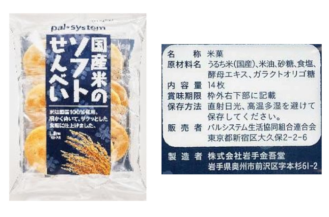 国産米のソフトせんべいと市販のせんべいの表示を見比べると、原材料の数から違います。ご自分の目で確認して、味の違いも確かめてみましょう。