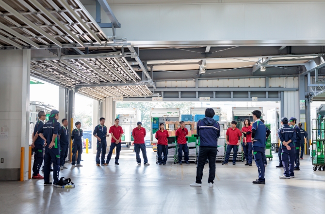 運転や当日の積み荷の注意事項などが全体に伝えられます。日々配達する荷物の状況は変わるので、一言も聞き逃せません。