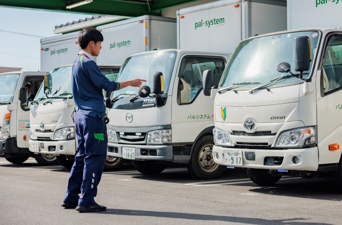 一日に60~70件ほどのお宅に伺います。準備が整ったら、車両点検を済ませて、いざ出発!
