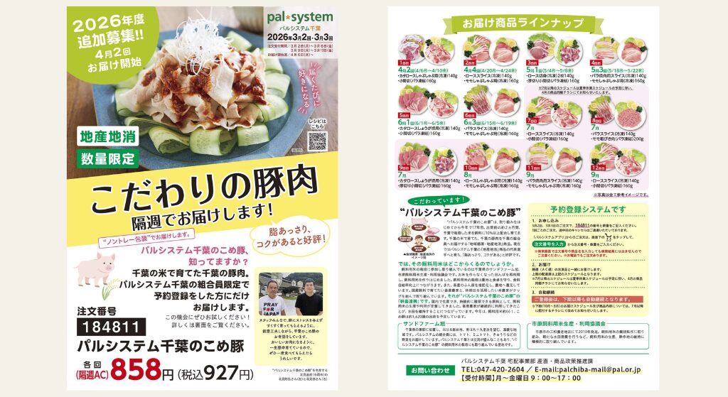 ※『パルシステム千葉のこめ豚』の予約登録は通年で募集しています。下記募集チラシ内の注文番号【184811】と数量をご記入またはご入力ください。